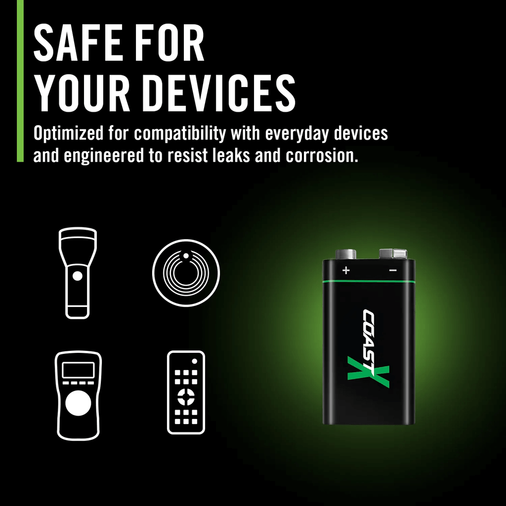 Each Coast Zithion X 9V Rechargeable Battery uses proprietary ZX Optimized Voltage™ technology to deliver a steady, device-safe output that mimics the performance of traditional single-use batteries. This helps ensure long runtimes and consistent performance while reducing the risk of flickering, overheating, or damage to sensitive electronics. The leak- and corrosion-resistant construction adds an extra layer of protection, giving you peace of mind in devices that often get installed and forgotten—like alarms, detectors, and security equipment.
